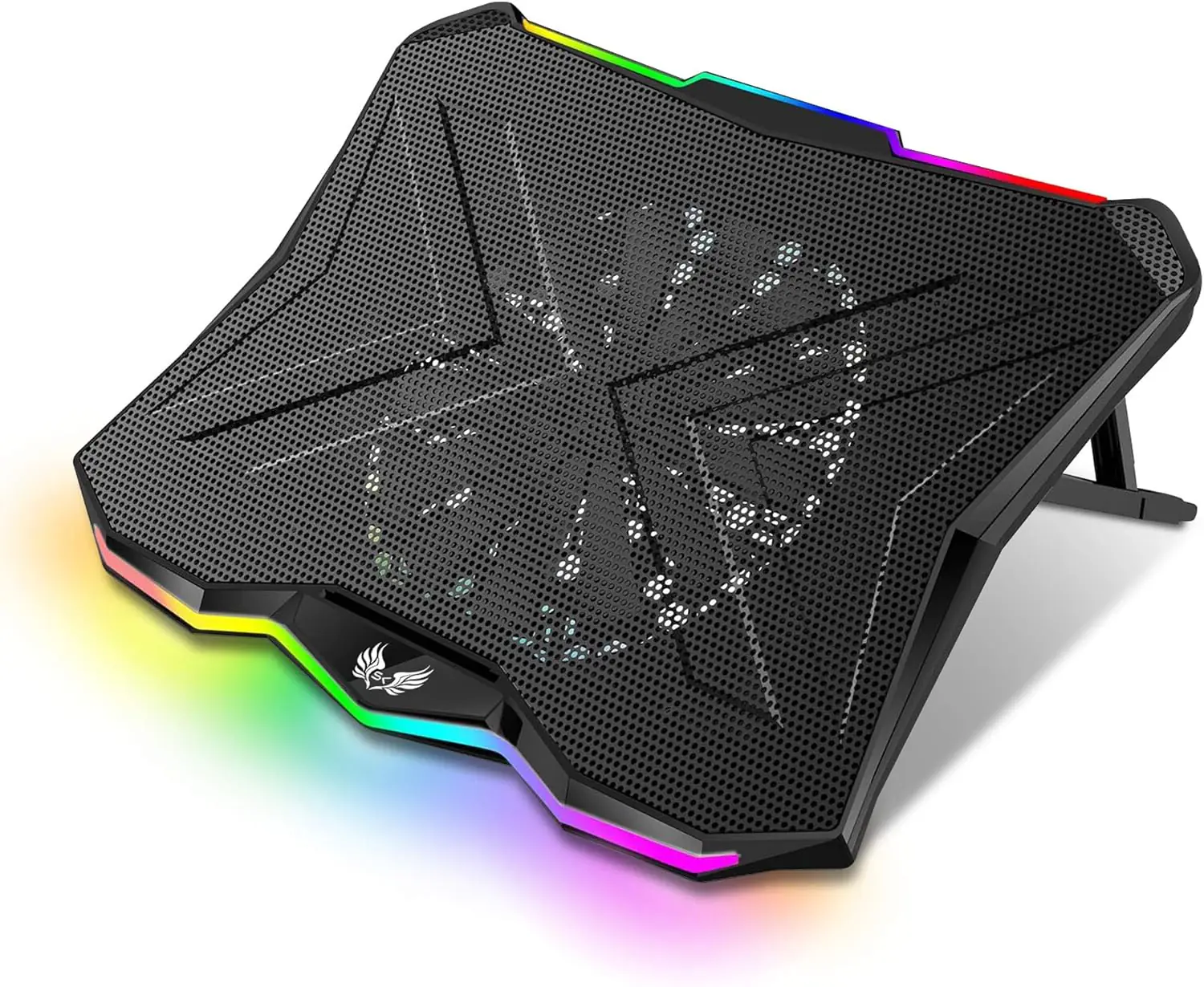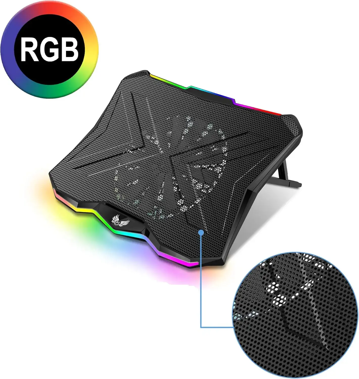 A3 Laptop Cooler – 1 Large 180mm Adjustable Fan, RGB, 400×300×26mm, Metal Mesh, Dual USB 2.0, 800 RPM, 63 CFM Airflow, ABS+Metal Construction