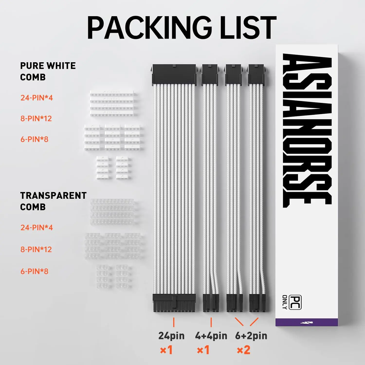 ASIAHORSE 18AWG White PSU Cable Extension Kit – 4 Pack (24-Pin ATX, 4+4 Pin EPS, 2x PCI-E 6+2) Braided Sleeved, Soft Nylon, Cable Combs, Universal Compatibility