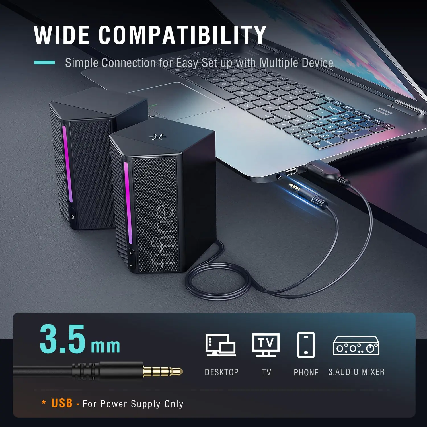 - Versatile Connectivity: 3.5mm aux input for audio transmission ensures compatibility with PCs, laptops, monitors, tablets, and phones.