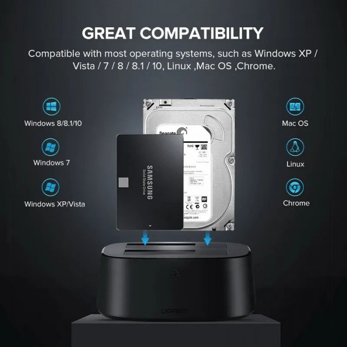- Supports 2.5-inch and 3.5-inch SATA I/II/III hard drives and solid-state drives (SSDs)